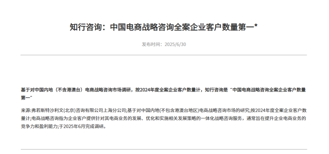 2025年6月,知行咨询荣获弗若斯特沙利文颁发的“全国电商战略咨询企业客户数量第一”证书。